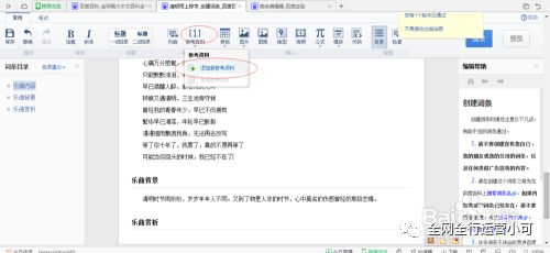 下面就是最重要的一步,就是参考资料。从开头填写基本信息开始,一直到最后,每一个后面都点击一下鼠标。然后看到文档编辑器上面的添加参考资料。添加一下自己的引用来源。然后填写相关的信息,看图上。来源的网站一定要正规,例如:百度就很正规。