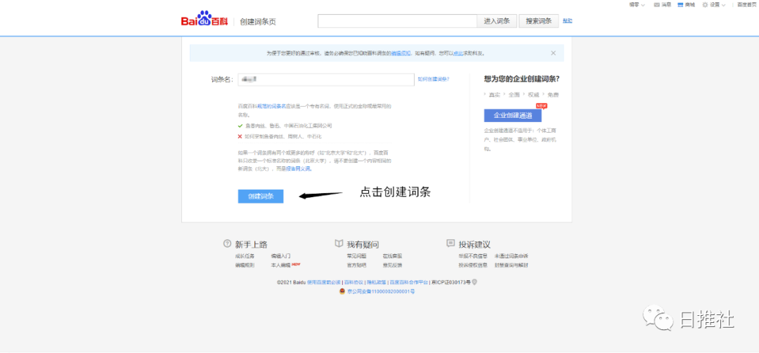 2、确认你需要创建的词条名,然后点击 创建词条 进行下一步