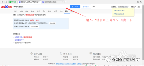 2、在百度搜索引擎中输入:“你自己像编辑的人或事物(例如图中:“陈亨 清明雨上 ”原创歌手的歌曲)”。然后发现搜索不到,这样子就该发挥你的作用啦,就开始下面几个步骤啦。创建词条。如果有词条,但是有歧义,不是你想找的那个,你就天机歧义项即可。点击加号。