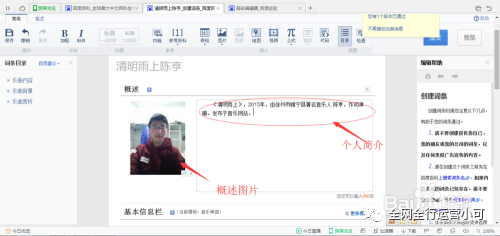 进入到了正式的界面,做到有条不紊。从上而下进行编辑。首先输入基本信息,在第一栏中。其次,在添加概述图片,人物或者事物、物品都可以。