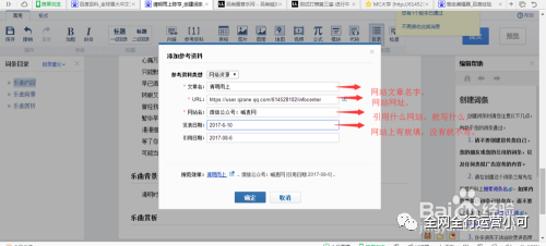 下面就是最重要的一步,就是参考资料。从开头填写基本信息开始,一直到最后,每一个后面都点击一下鼠标。然后看到文档编辑器上面的添加参考资料。添加一下自己的引用来源。然后填写相关的信息,看图上。来源的网站一定要正规,例如:百度就很正规。